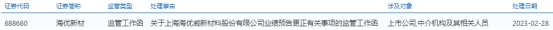 上交所网站昨日发布了对海优新材(688680.SH)的监管工作函,处理事由关于海优新材业绩预告更正有关事项,涉及对象包括上市公司、中介机构及其相关人员。
