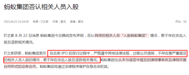 据蚂蚁集团发布声明表示,关于网传相关人员“入股蚂蚁集团”为不实消息。此前IPO的发行过程公开透明,不存在相关人员入股的情况。