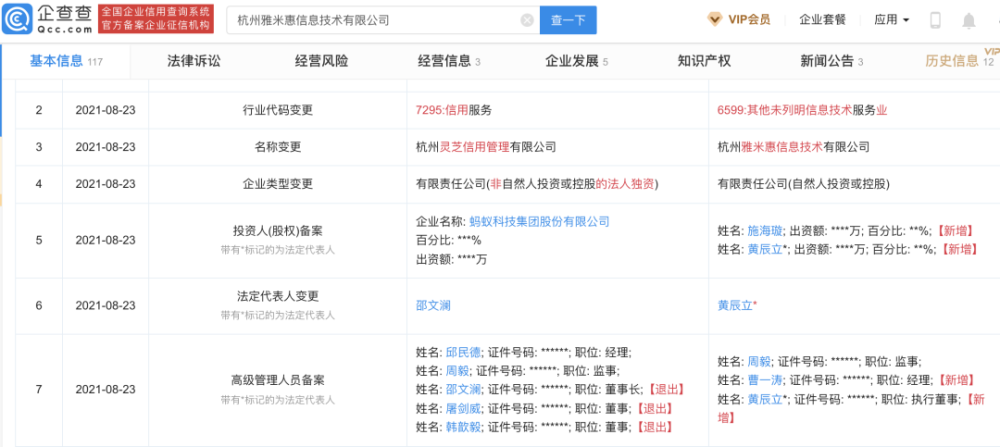 同时,杭州灵芝信用管理有限公司更名为杭州雅米惠信息技术有限公司,蚂蚁集团副总裁邵文澜、屠剑威、韩歆毅相继退出灵芝信用法人、董事长、董事等职位,新增曹一涛为总经理,黄辰立为法人和执行董事。经营范围变更后,不在含有企业信用管理、企业管理咨询等服务。
