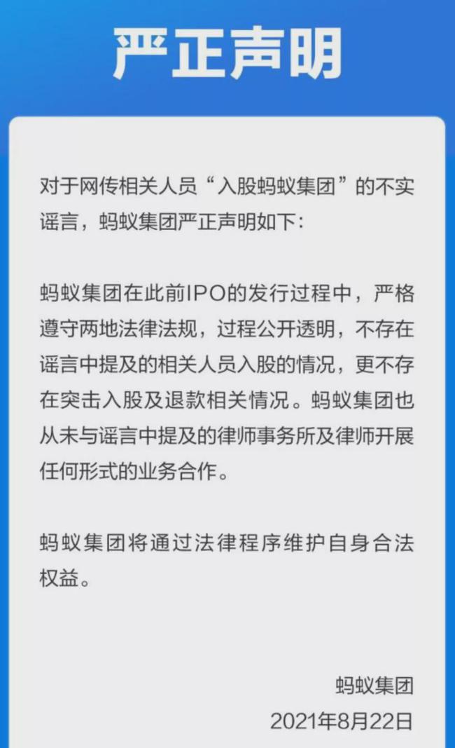 随后蚂蚁集团急忙出来表态,蚂蚁集团目前无人入股,依照蚂蚁现在的实力不需要进行融资,网上的一些言论也不属实。而马云却一直没有发言,根据好友蔡崇信透漏,马云现在整日在家画画,看书,关注着慈善公益。看来马云已经要慢慢淡出整个市场了。