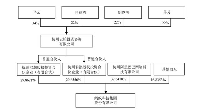 而在蚂蚁集团的股东名单当中,持股比例为32.6470%的阿里巴巴是第一大股东,持股比例为29.8621的杭州君瀚是第二大股东,持股比例为20.6556%的杭州君澳公是第三大股东,其次才是持股比例为16.8353%的其他股东。然而杭州君瀚宇杭州君澳背后均是由杭州云铂投资的,杭州云铂背后的实际控制人则是马云,个人持股34%。