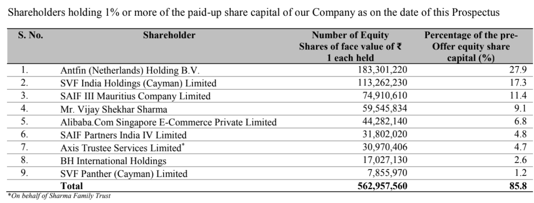 截至招股书发布日,蚂蚁集团全资子公司Antfin (Netherlands) Holding B.V.持股27.9%,为公司的第一大股东。支付宝新加坡子公司Alibaba.Com Singapore E-Commerce Private Limited持股7.32%,软银集团持股18.73%,Paytm创始人Vijay Sharma夏尔马则持有14.61%的股份。