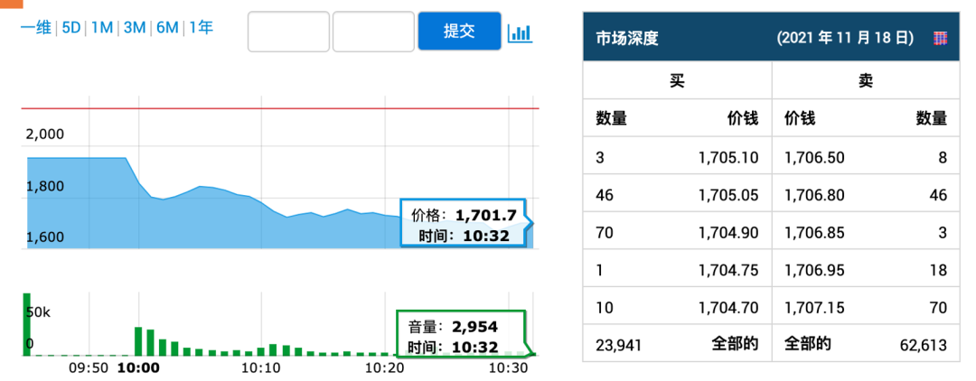 11月18日,印度支付巨头Paytm挂牌上市,发行价为2150卢比/股(约合28.8美元/股),上市首日遭遇破发,开盘价为1955卢比/股,低开9.07%。截至发稿,Paytm报价1701卢比/股,跌幅达12.96%。