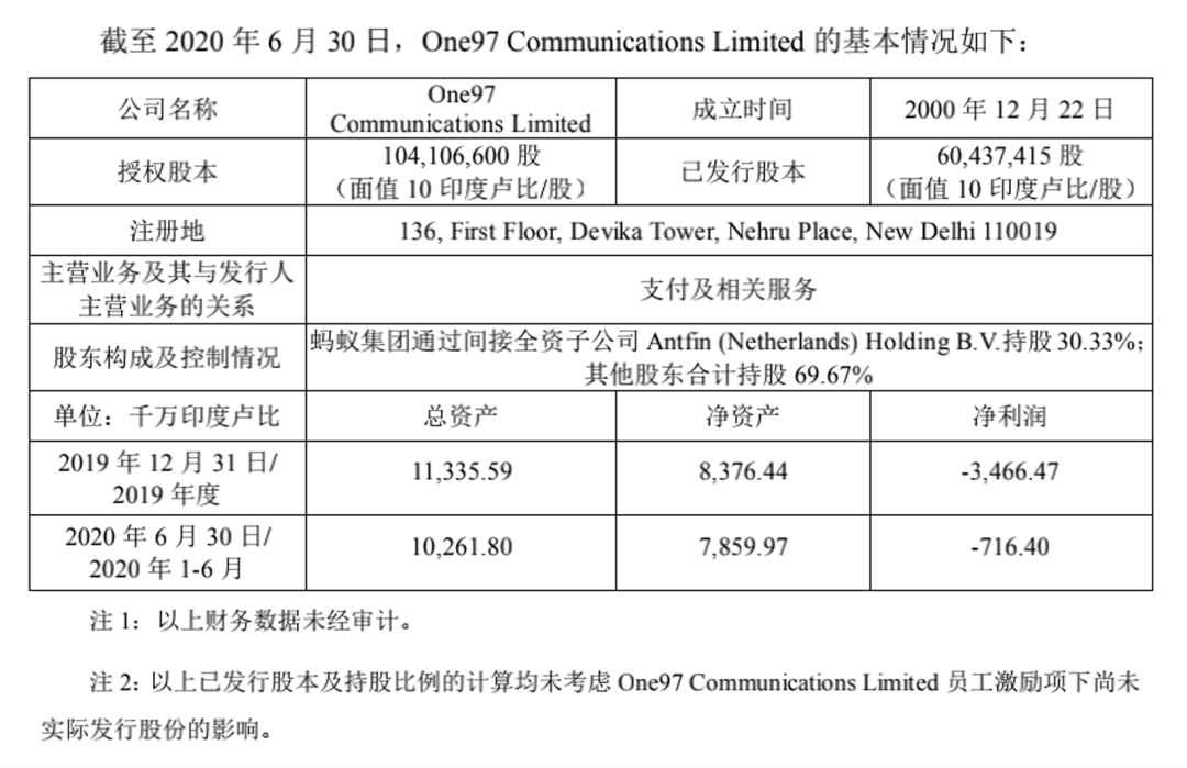 近年来,蚂蚁集团曾多次投资Paytm。蚂蚁集团2020年8月招股书显示,蚂蚁集团对Paytm的投资总额约为29亿元,通过子公司Antfin (Netherlands) Holding B.V.持有Paytm母公司 30.33%的股份。