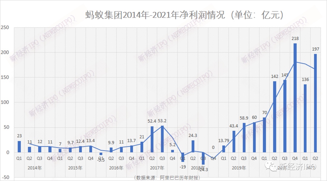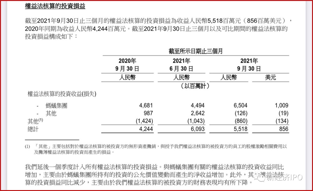 由于阿里巴巴采用延后一个季度确认投资损益的策略,因此,2021年三季报中确认的收益实际为蚂蚁集团2021年二季度的利润。阿里巴巴持有蚂蚁集团33%的股权,由此计算可知,蚂蚁集团2021年第二季度的净利润约为197亿元。