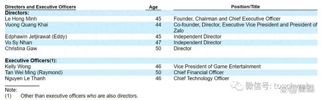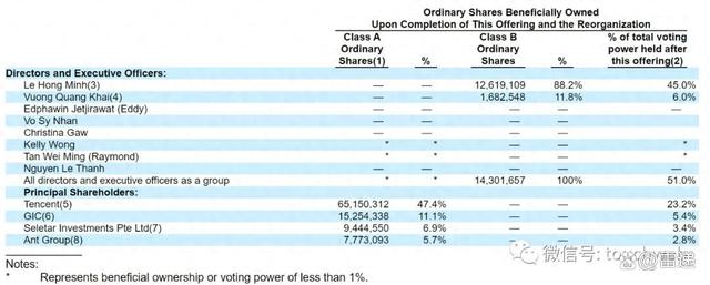 IPO前,VNG创始人、CEO黎洪明(Le Hong Minh)持有88.2%的B类股,及45%的投票权;另一位联合创始人、总裁王光凯(Vuong Quang Khai)持有11.8%的B类股,及6%的投票权。
