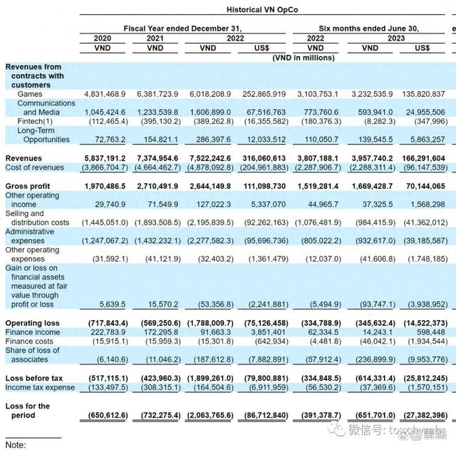VNG在2023年上半年营收为39577亿越南盾(约1.66亿美元),上年同期的营收为3,8071.88亿越南盾;净亏损为6517亿越南盾(约2738万美元),上年同期的净亏损为3913.79亿越南盾。