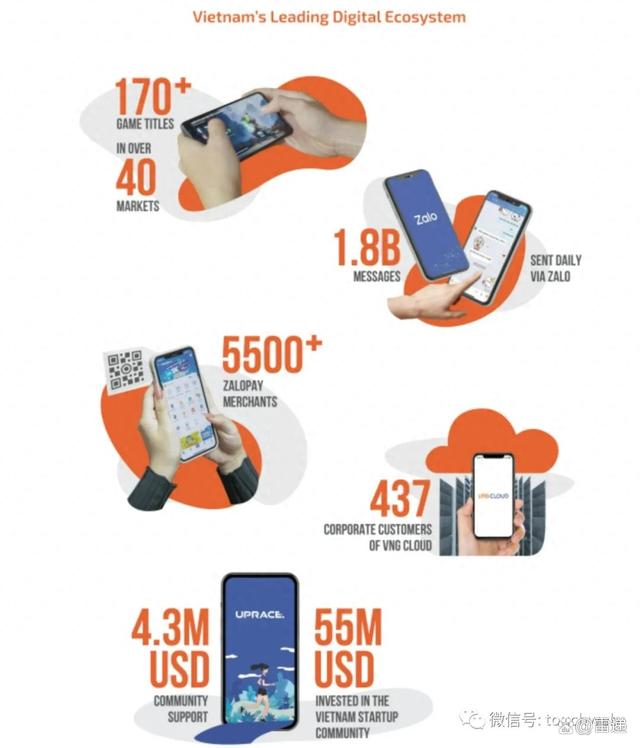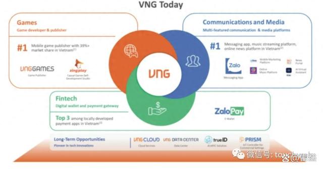 VNG成立于2004年,旗下拥有越南最大的即时通讯应用Zalo,也是越南最大的游戏公司,还有音乐网站(Zing Mp3)、金融服务(ZaloPay)和云服务(VNG cloud)等。