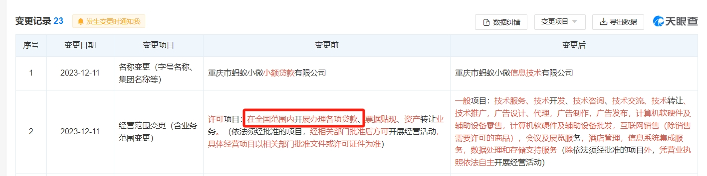 12月12日,资料显示,重庆市蚂蚁小微小额贷款有限公司更名为重庆市蚂蚁小微信息技术有限公司。其经营范围去除“在全国范围内开展办理各项贷款、票据贴现、资产转让业务”,新增广告制作、互联网销售、酒店管理等。