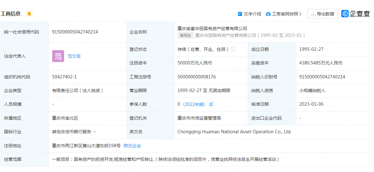 渝富华贸成立于1995年,实际控制人为重庆市国有资产监督管理委员会。