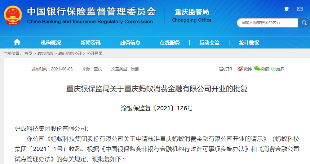 2021年6月,蚂蚁消金获得开业批复。据悉,蚂蚁消金获准开业后,将主要承接蚂蚁集团整改后的消费金融业务。