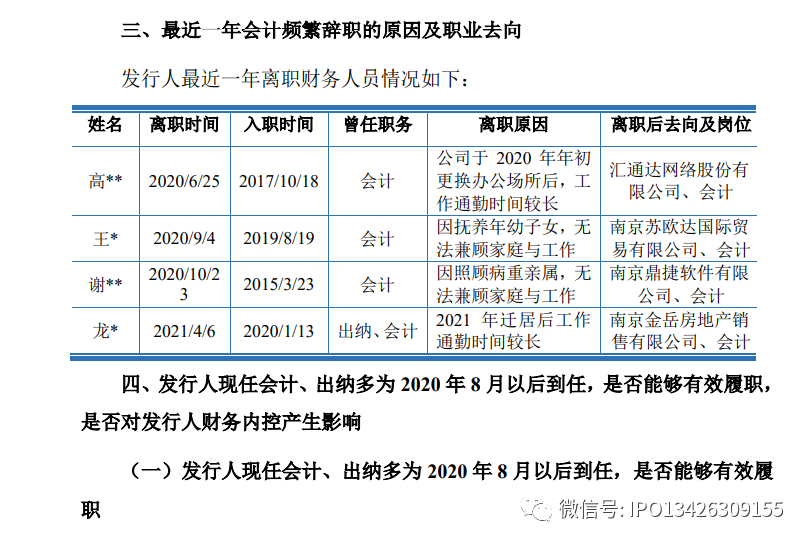 11.2 根据申报材料,2020 年和 2021 年发行人有四名会计离任,目前在任的五名会计多为最近一年聘任。请发行人进一步说明:(1)最近一年会计频繁辞职的原因及职业去向;(2)发行人现任会计、出纳多为 2020 年 8 月以后到任,是否能够有效履职,是否对发行人财务内控产生影响。