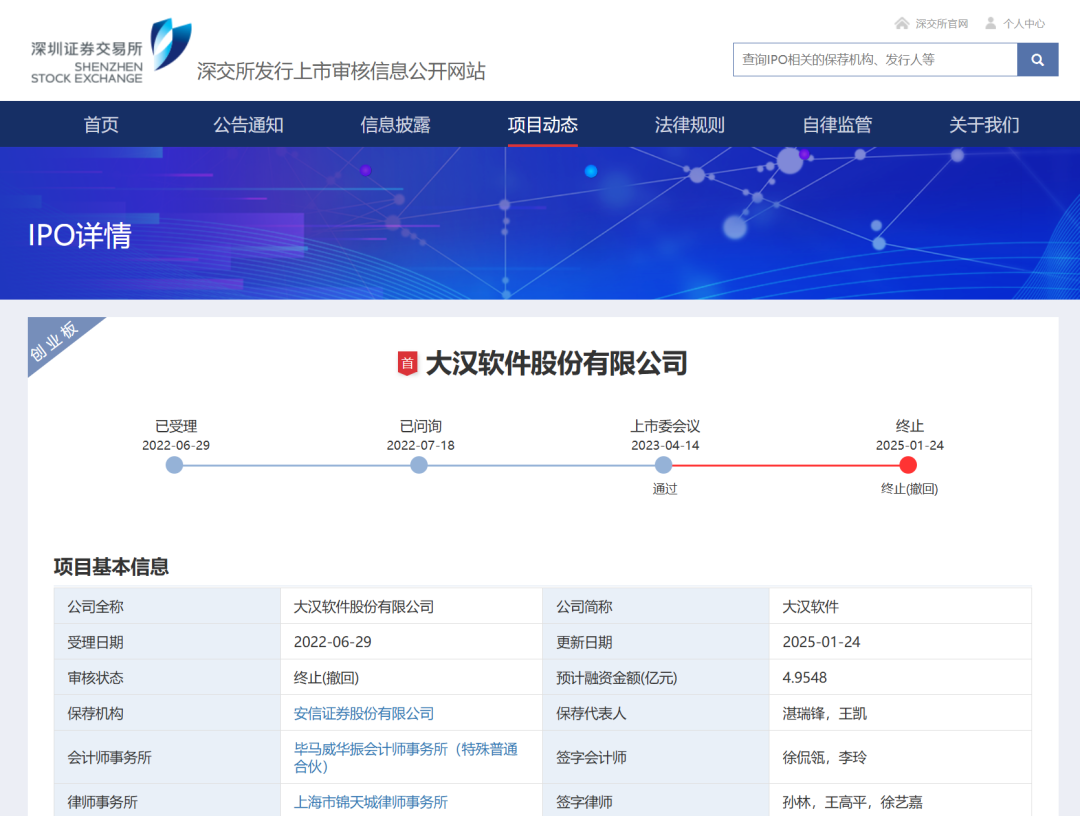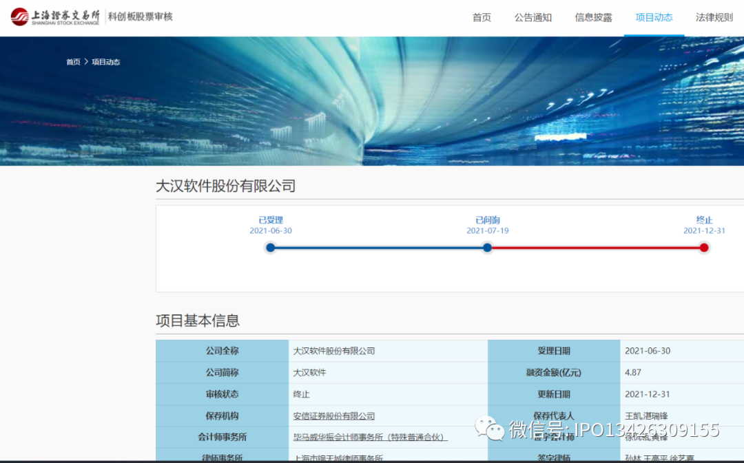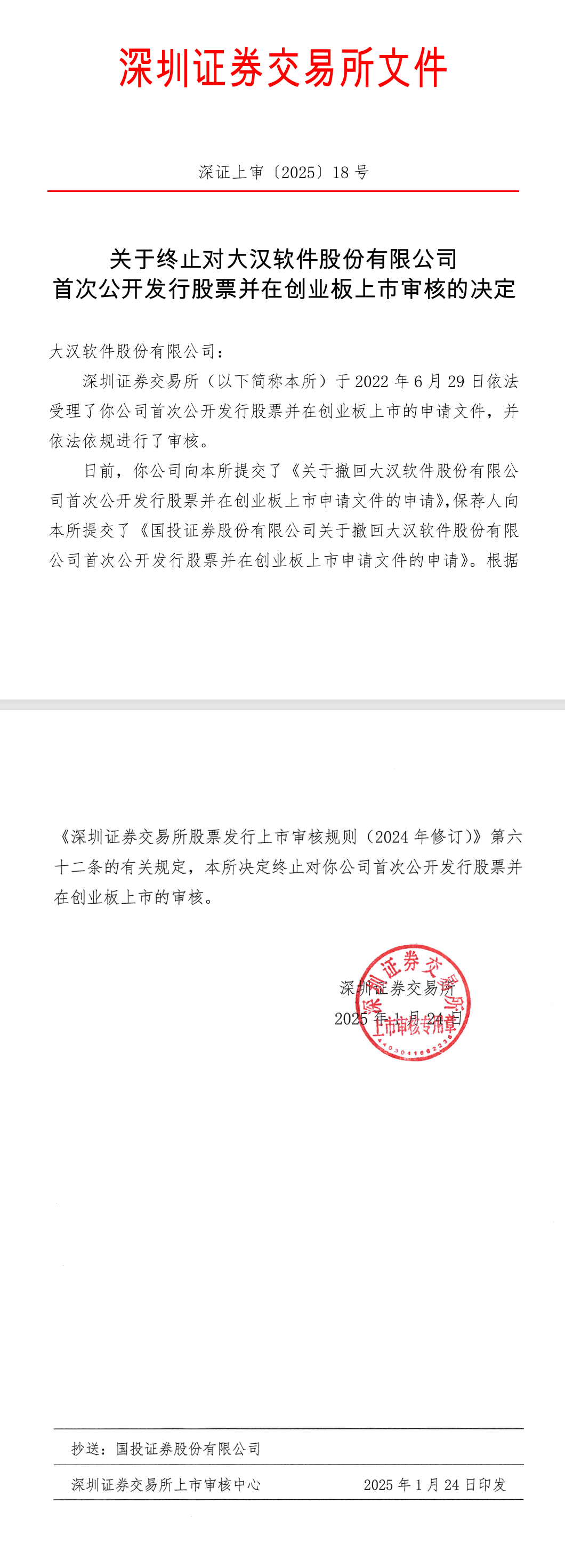 2021 年 12 月 31 日,你公司和保荐人安信证券股份有限公司分别向本所提交了《关于撤回大汉软件股份有限公司首次公开发行股票并在科创板上市申请文件的申请》(大汉发【2021】167号)和《安信证券股份有限公司关于撤回大汉软件股份有限公司首次公开发行股票并在科创板上市申请文件的申请》(安证报【2021】750 号),申请撤回申请文件。根据《上海证券交易所科创板股票发行上市审核规则》第六十七条的有关规定,本所决定终止对你公司首次公开发行股票并在科创板上市的审核。