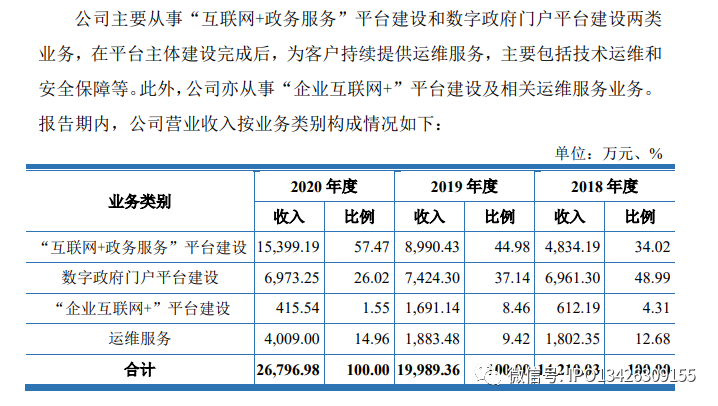 报告期内,公司主营业务收入分别为26,796.98 万元、29,322.88 万元及34,536.89万元,呈现快速增长态势。其中,“互联网+政务服务”平台建设、数字政府门户平台建设及运维服务业务各期收入合计金额分别为26,381.44万元、28,642.42万元和33,394.72万元,合计占营业收入的比例分别为 98.45%、97.68%和 96.69%,主营业务收入构成相对稳定。