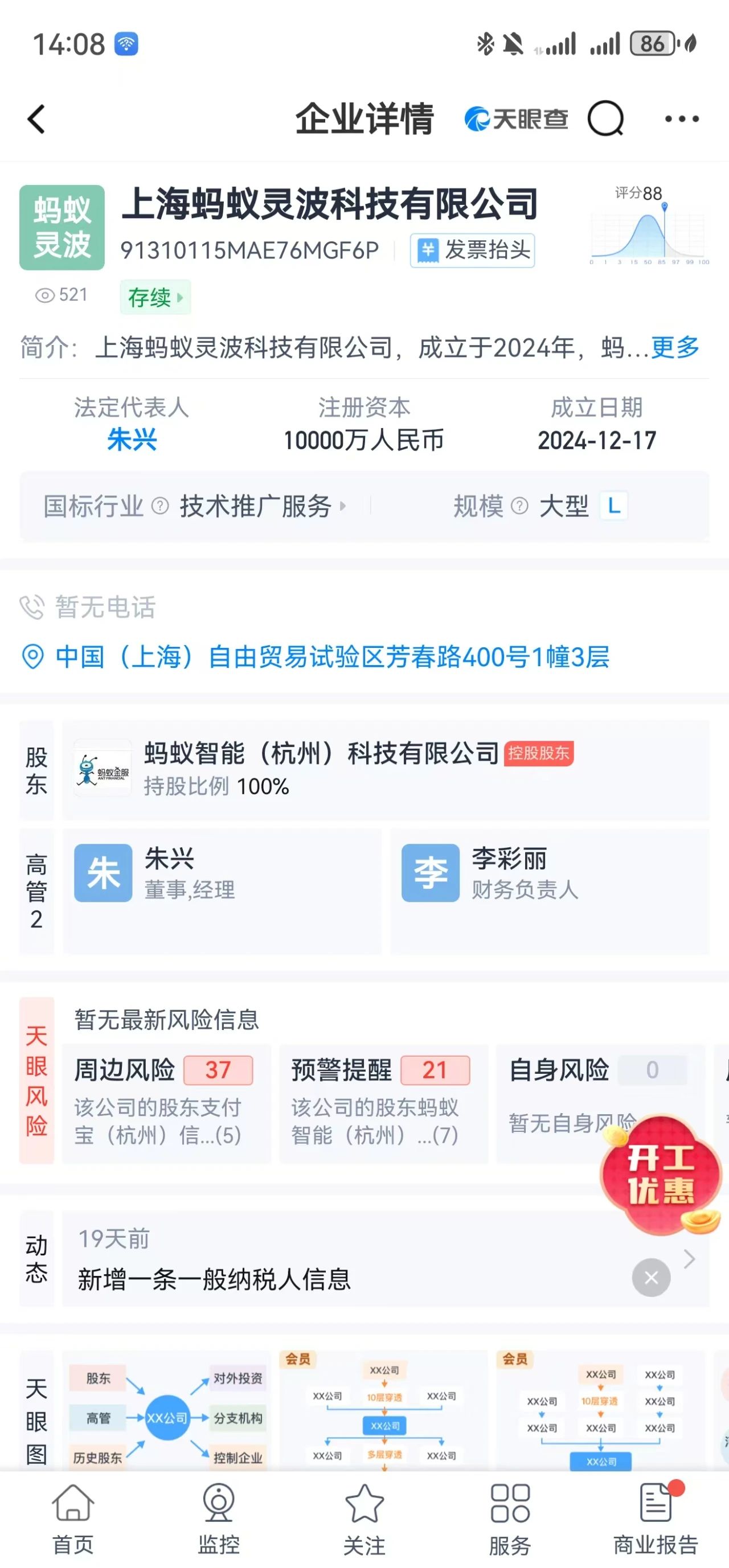 天眼查信息显示,上海蚂蚁灵波科技有限公司成立于2024年,蚂蚁集团成员,位于上海市,注册资本10000万人民币。