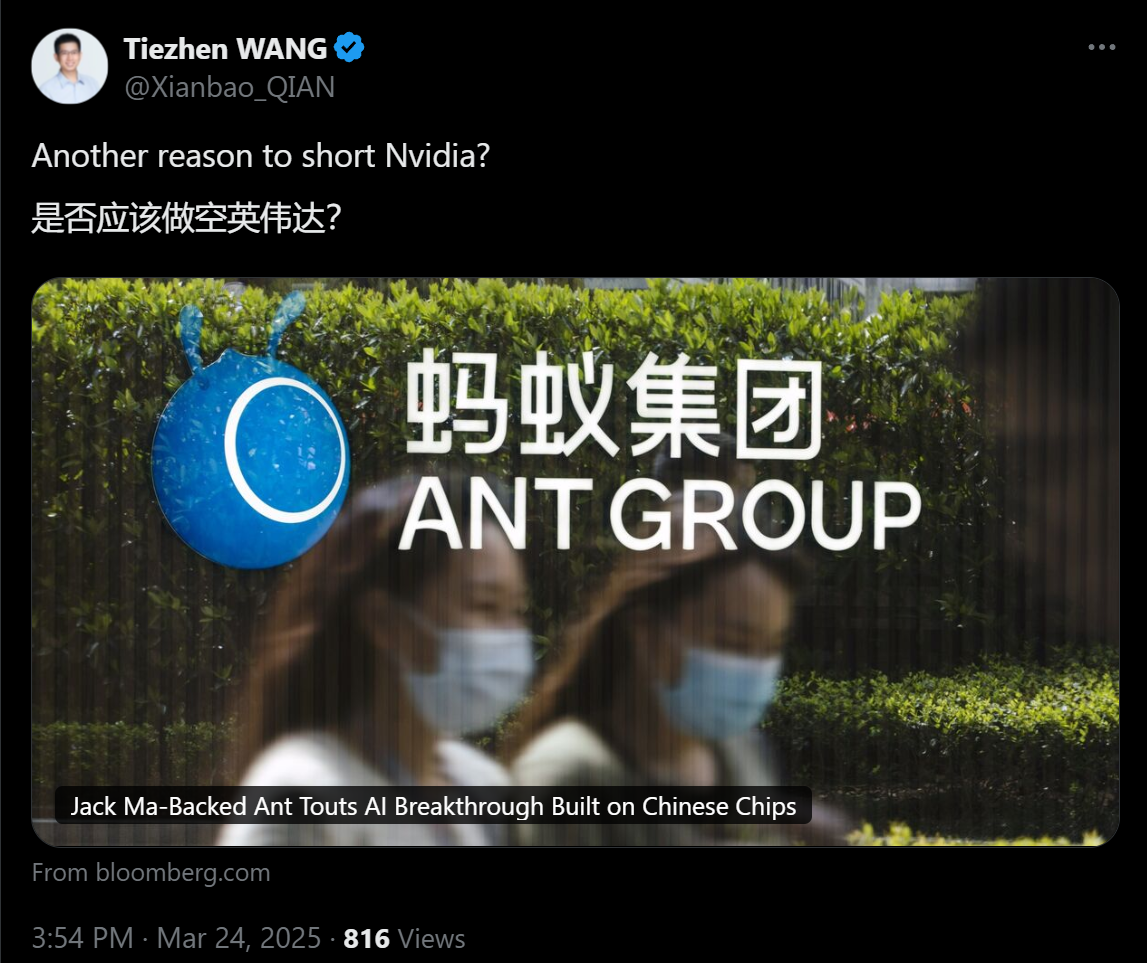 但百灵系列混合专家模型的横空出世,让市场再次质疑英伟达的“算力信仰”。HuggingFace工程师Tiezhen Wang在社交媒体上表示,“做空英伟达的又一理由?”