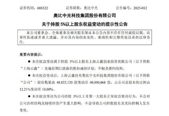 根据奥比中光近期公告,蚂蚁集团旗下上海云鑫投资管理有限公司在2025年1月10日至3月14日期间,通过集中竞价及大宗交易减持奥比中光882.2万股(占总股本2.21%),套现约5.56亿元。减持后,蚂蚁仍持有10%股份,居第二大股东。