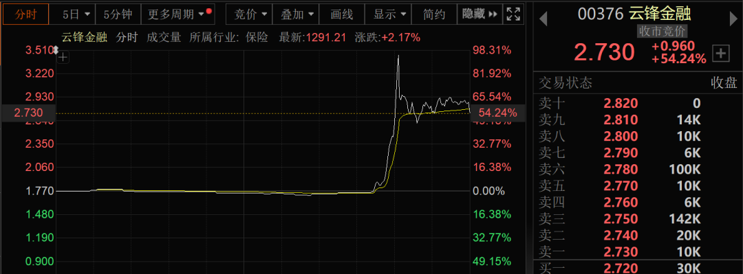 6月12日尾盘,港股蚂蚁集团概念股直线拉升,云锋金融盘中一度拉升超98%,最终收涨54.24%。