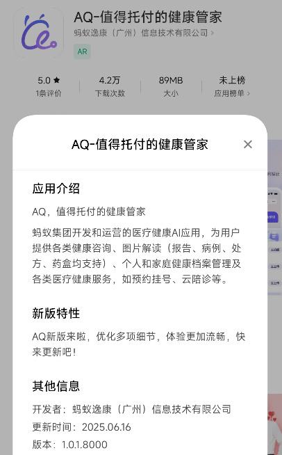 6月16日,蚂蚁集团悄然上线医疗健康AI应用AQ。