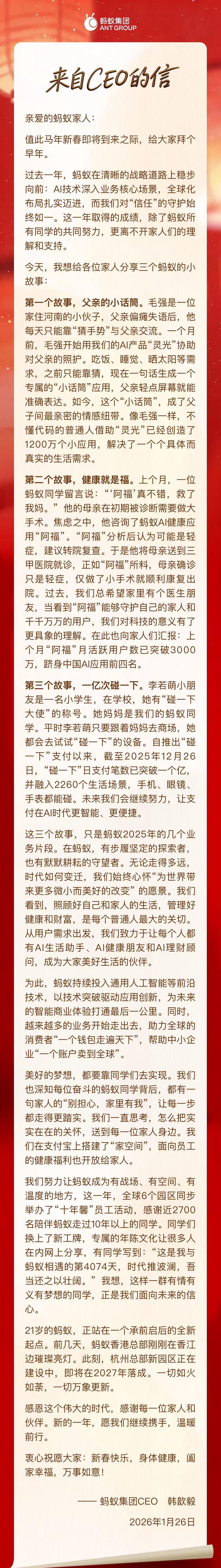 近日,蚂蚁集团CEO韩歆毅给全体员工及家属发了一封“家书”。在这封不到1500字的信中,他分享了三个蚂蚁的小故事,分别点名“灵光”“阿福”“碰一下”三项AI新业务。