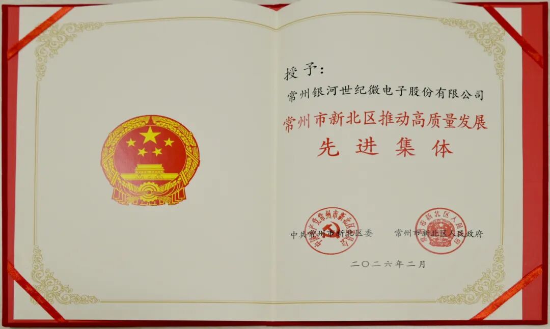 喜报传来,载誉前行!近日,常州银河世纪微电子股份有限公司凭借在半导体领域的技术创新与产业贡献,荣获常州市新北区推动高质量发展先进集体称号,以硬核实力获评区域高质量发展标杆企业。