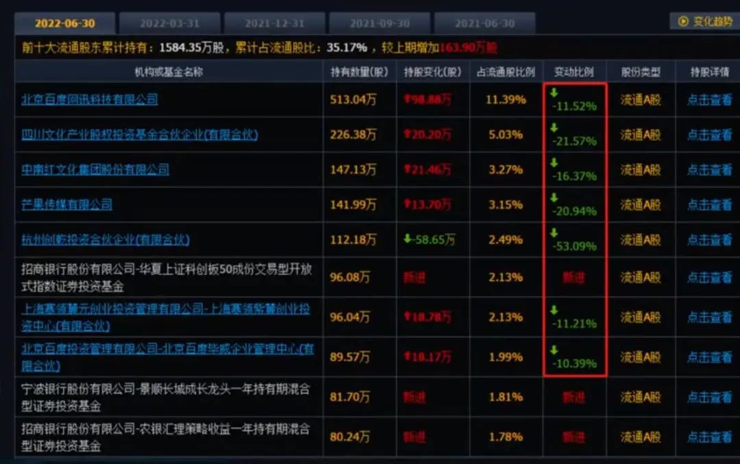 资料显示,持股5.03%的四川文化产业股权投资基金合伙企业变动比例为-21.57%;
