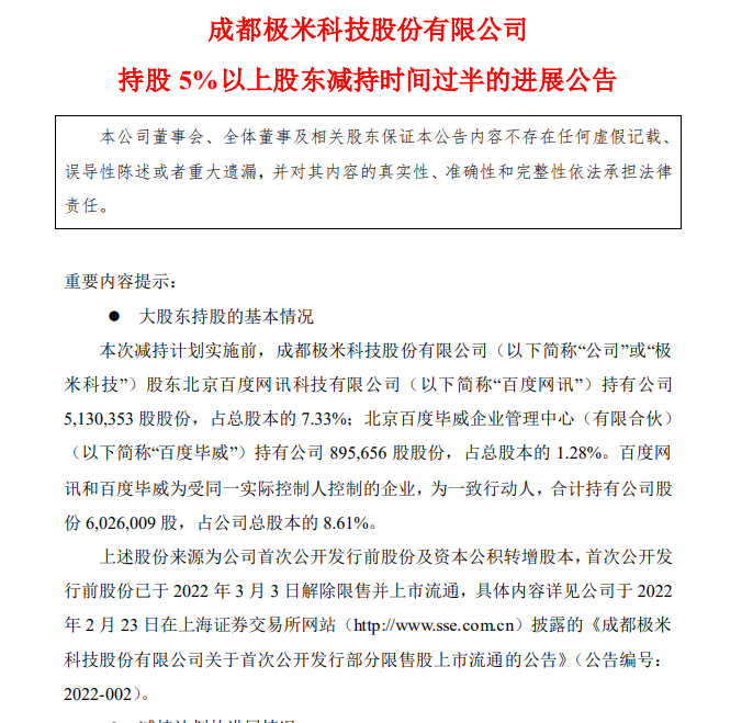 公告显示,截至2022年8月19日,百度毕威、百度网讯通过大宗交易、集中竞价方式累计减持93.5万股,占公司总股本的1.34%。