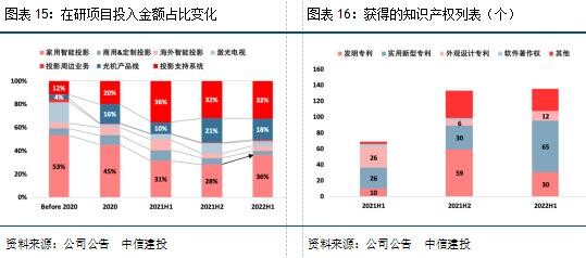 2)从研发成果来看,极米2021H2-2022H1获得的研发成果数量明显增多,其中新获得发明专利59、30个,实用新型专利30、65个。截至 2022 年 6 月 30 日,公司已拥有专利 642 项,其中发明专利 142 项、实用新型专利 298 项、外观设计专利 202 项,计算机软件著作权 50 项。此外,极米已经获得了50项各类国际大奖,包含了CES最佳创新奖、红点奖、iF奖、GoodDesignAward和IDEA奖。