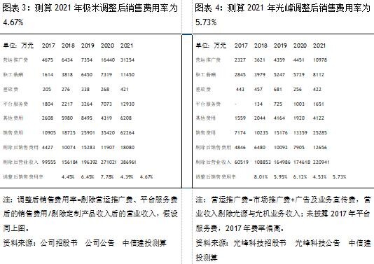 其次,极米和光峰两家公司销售渠道也存在区别:极米主要通过电商平台实现销售,因此平台运营及服务支出较高,这部分费用是固定费用,且零售价格与供货价格之间价差的费用化规模较大;而光峰科技经销商收入比重较大,因此销售费用相对较少,同时费用化的规模也较小。还原销售渠道可以发现,如果同时剔除定制产品收入和平台费用端的影响,极米调整后的销售费用率为4.67%,光峰调整后的销售费用率为5.73%。这个维度可以说明,抛开一些固定的平台费用,极米销售费用率低于光峰。