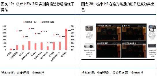 产品优势:更加均衡的表现,更优秀的综合体验。对比同价位、其他技术路径投影仪,极米LED产品画质表现更均衡,并且有出色系统加持。经过实测,极米NEW Z6X(0.33” DMD显示芯片)的实测亮度高于大眼橙NEW X7D(0.47” DMD显示芯片);极米H5(三色LED)的暗光场景表现媲美坚果N1 Pro(三色激光)。此外,极米自主开发的GMUI系统流畅度出众,为消费者提供更好的投影仪使用体验。