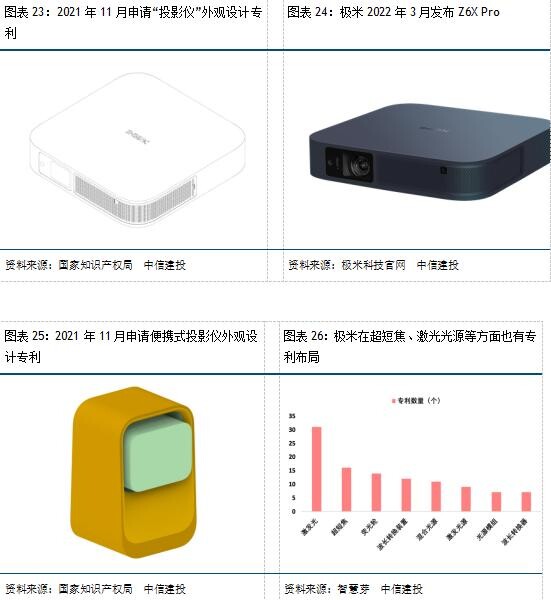 中信建投判断,极米新型显示技术产品研发已到后半段,超短焦等领域早有技术和产品储备。极米2021年11月同时申请两款投影仪的外观设计专利,其中Z6X Pro已在2022年3月发布。中信建投判断另一款“便携式投影仪”已经处在集成产品研发(IPD)的后半段,预计2023H1发布。此外,极米2019年申请的“超短焦投影仪”专利在2020-2021年获得授权,此前已有完整Demo,未来有望提升品质并后发制人。结合前文产品迭代的分析,预计极米未来会持续有新技术落地,未来更高品质、更多元化、价格带更完善的产品推向市场的速度有望加快。