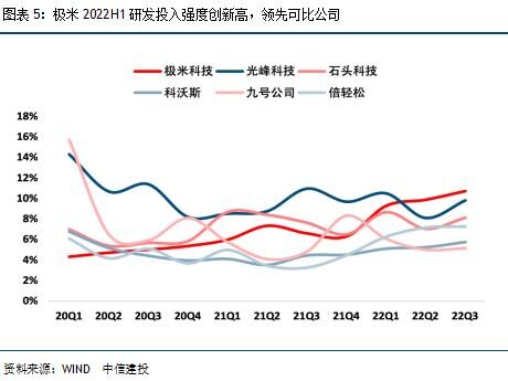 先从3C消费品大行业看。比较6家公司近三年的研发费用率可以发现,在最近的2022年Q3,极米科技的研发费用率达到10.7%排名第一,其次是光峰科技、石头科技和倍轻松。而横向看极米科技的研发费用率可以发现,极米的研发费用率保持稳定增长状态,从2020年Q1的4.3%增长到2022年Q3的10.7%,单季研发费用率超过10%。