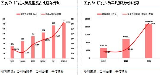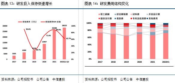 研发费用持续大幅增加,主要系加大新产品和新技术研发投入。除了研发团队规模及薪酬增长的因素外,研发费用高增的主因系:持续加大新产品+新技术的研发投入,折旧摊销及开发设计费用增加,两者合计占比从2020年的7%左右提升至2021年、2022H1的12%以上。