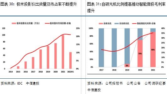 市场份额第一,光机自研推动降本。极米市场份额持续提高,但是硬件利润微薄,根据极米董事长在亿万创业营的分享,Z4X毛利率仅有5%。因此极米通过光学研究+扩充产品线,解决国产替代和降本增效的问题。1)2014年成立光学实验室对基础光学进行研究,2019年光机自研突破并逐步导入量产,2021年自研光机比例达90%,已实现中高端产品的全面导入;2)2015年开始在Z系列的基础上,推出便携系列、H系列、激光电视、智能投影吸顶灯、RS系列等产品。2018年以来,极米国内市场出货量稳居第一,市场占有率超过20%,呈现*的*优势;同时毛利率整体提升。