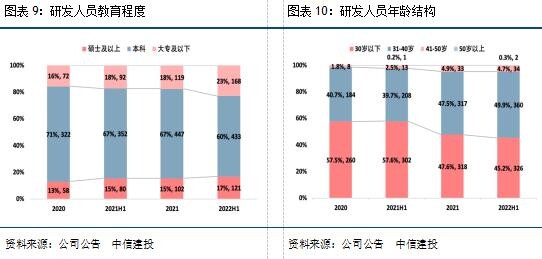 从人才结构上看,截至2022H1,17%的研发人员拥有硕士及以上学位,其中有3名研发人员拥有博士学位,硕博研发人员数量及比例提升;95%的研发人员小于40岁,研发队伍以青壮年为主。极米打造了一支结构合理、技能全面的高素质研发人才队伍,有力支撑其技术创新和产品研发。