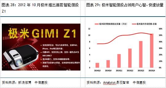聚焦家用场景,智能化实现突破。极米通过颠覆式创新开创家用智能投影品类,初创团队将LED光源应用于投影仪,解决灯泡耗材问题;开发GMUI系统,解决内容互联问题;发明自动对焦系统,解决产品调试问题;重新定义家用投影仪产品,智能投影走入千家万户。从Z1到Z3,以及软件系统都经历反复的调校和改进,2014年4月才正式对外发布第一代量产产品极米Z3。在资本助推下,极米正式进入量产阶段,同时补足内容端和渠道端缺口,极米智能微投销量快速提升。