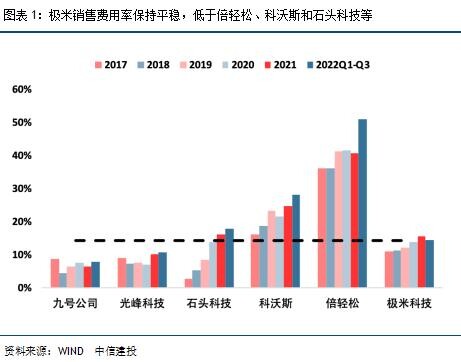用数据说话。2022年Q3,极米营销费用力度保持在13%-16%区间,这是什么水平?与市面上主流的多个3C电子消费品牌相比,倍轻松的营销费用率超过50%,科沃斯约在30%,石头科技也在19%左右。因此在整个大3C环境中,极米营销费用率处于低位,明显低于倍轻松、科沃斯和石头科技等可比公司。