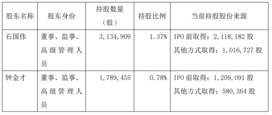 减持前,石国伟直接持有公司313.49万股股份,占公司总股本的1.37%;钟金才直接持有公司178.95万股股份,占公司总股本的0.78%。减持后,石国伟持有公司股份数为298.49万股,持股比例为1.30%;钟金才持有公司股份数为175.00万股,持股比例为0.76%。