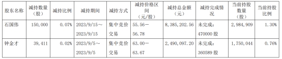 9月15日,石国伟减持公司股份数量15万股,减持比例0.07%,减持价格区间为55.56元至56.78元,减持总金额为838.52万元,未完成减持的股数为47万股;9月5日,钟金才减持公司股份数量3.94万股,减持比例0.02%,减持价格区间为63.00元至63.67元,减持总金额为249.01万元,未完成减持的股数为36.06万股。