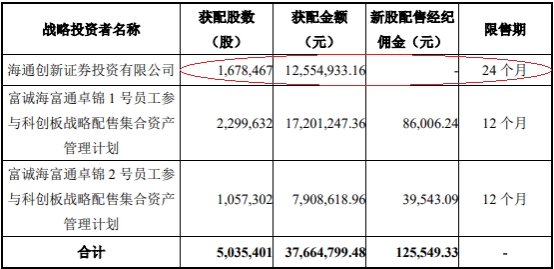本次发行的战略配售由保荐机构相关子公司跟投、卓锦股份的高级管理人员与核心员工专项资产管理计划组成。其中,海通创新证券投资有限公司获配股数167.85万股,获配金额1255.49万元,限售期24个月。