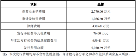 卓锦股份本次发行费用为5030.69万元,其中,海通证券股份有限公司获得保荐及承销费用2770.00万元。