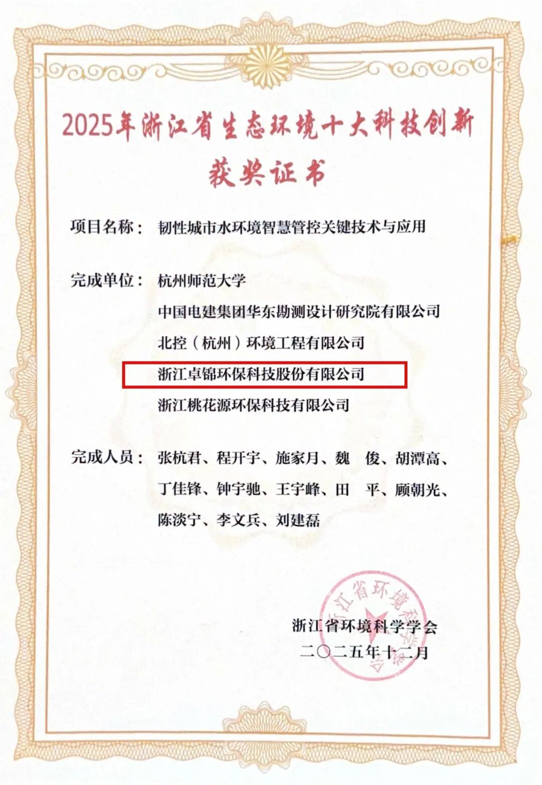 与此同时,由卓锦股份携手省内多家科研及产业单位联合攻关的科研成果——“韧性城市水环境智慧管控关键技术与应用”,成功入选浙江省环境科学学会评定的“2025 年浙江省生态环境十大科技创新”名单,再次印证了公司在生态环境科技创新领域的硬核实力。