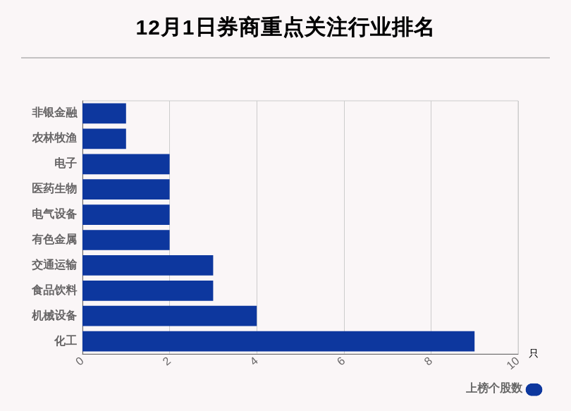 从券商对行业的关注度来看,券商关注个股数居前的行业分别是化工、机械设备、食品饮料。