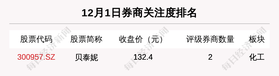 从券商对个股的关注程度来看,有1只个股获得多家券商关注,券商关注数量排名居前的个股是贝泰妮(300957.SZ)。