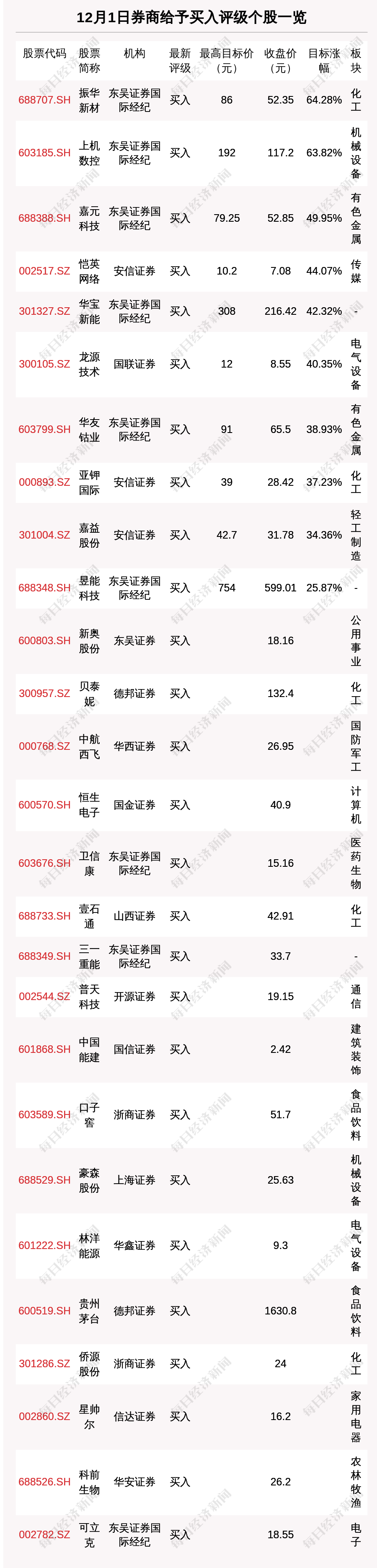 12月1日,券商给予评级的个股数共有46只,获得买入评级的个股数共有27只。在公布了目标价格的10只个股中,按照最新收盘价计算,预期涨幅排名居前的个股是振华新材(688707.SH)、上机数控(603185.SH)、嘉元科技(688388.SH),预期涨幅分别是64.28%、63.82%、49.95%。