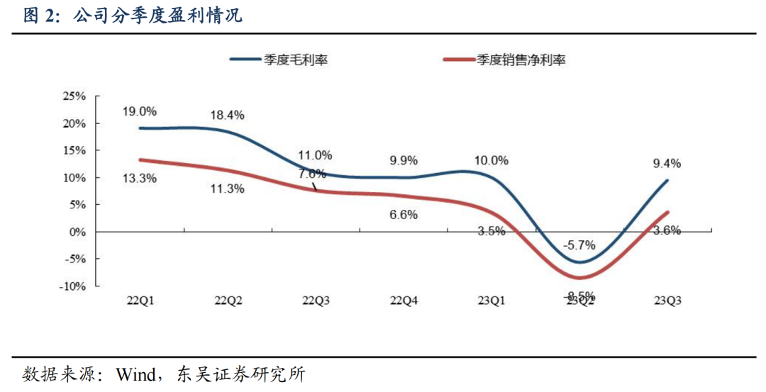 2023年Q3毛利率转正,单吨利润恢复正常水平。盈利端来看,23Q3单吨净利0.7万元左右,环比扭亏为盈,盈利能力改善明显,主要系产能利用率恢复降低生产成本,以及存货减值影响减小,公司Q3含税均价23万元/吨左右,环比持平左右,毛利率9.5%,环比增长15pct,对应单吨毛利1.9万元左右,我们预计Q4单吨盈利有望进一步恢复,全年单吨利润达0.3-0.4万元/吨。
