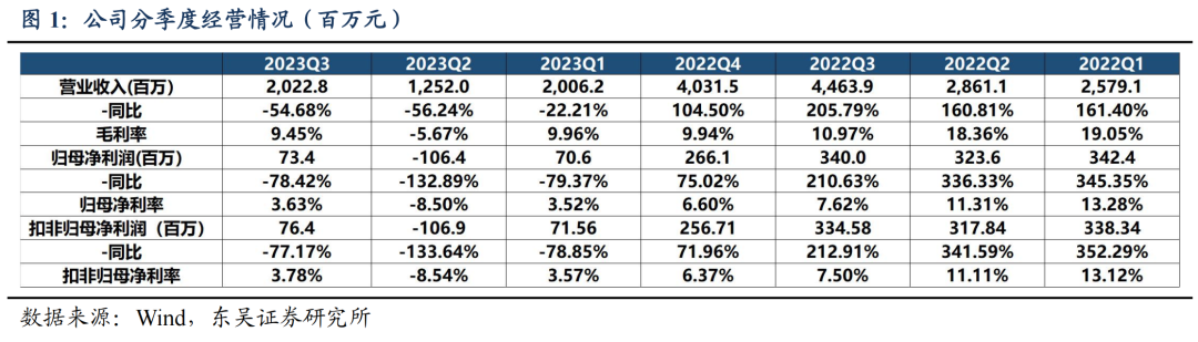 2023年Q3公司实现归母净利润0.73亿元,环比下降168.95%,略超市场预期。2023年前三季度公司营收52.81亿元,同比下降46.68%;归母净利润0.38亿元,同比下降96.26%;扣非净利润0.41亿元,同比下降95.86%。2023年Q3公司实现营收20.23亿元,同比下降54.68%,环比增长61.57%;归母净利润0.73亿元,同比下降78.42%,环比下降168.95%,扣非归母净利润0.76亿元,同比下降77.17%,环比下降171.45%。盈利能力方面,23Q3毛利率为9.45%,同比下降1.52pct,环比增长15.12pct;归母净利率3.63%,同比下降3.99pct,环比增长12.13pct。