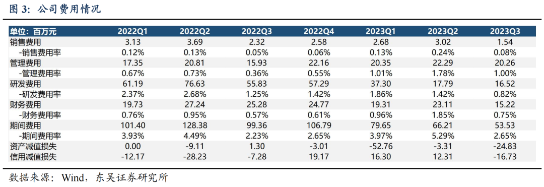 公司Q3期间费用率环比下降。2023Q3期间费用合计0.54亿元,同比下降46.12%,环比下降19.15%,期间费用率为2.65%,同比增0.42pct,环比降2.64pct;销售费用0.02亿元,销售费用率0.08%,同比增0.02pct,环比降0.17pct;管理费用0.2亿元,管理费用率1%,同比增0.64pct,环比降0.78pct;财务费用0.15亿元,财务费用率0.75%,同比增0.19pct,环比降1.09pct;研发费用0.17亿元,研发费用率0.82%,同比降0.43pct,环比降0.6pct。公司2023Q3计提资产减值损失0.25亿元,计提信用减值损失0.17亿元。