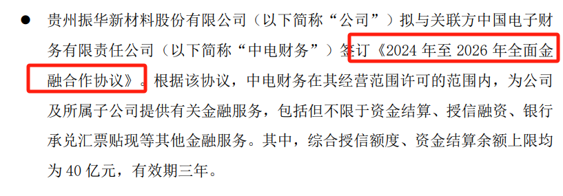 1月26日晚间,振华新材拟与关联方中国电子财务有限责任公司签订《2024年至2026年全面金融合作协议》。根据该协议,中电财务在其经营范围许可的范围内,为公司及所属子公司提供有关金融服务,包括但不限于资金结算、授信融资、银行承兑汇票贴现等其他金融服务。其中,综合授信额度、资金结算余额上限均为40亿元,有效期三年。