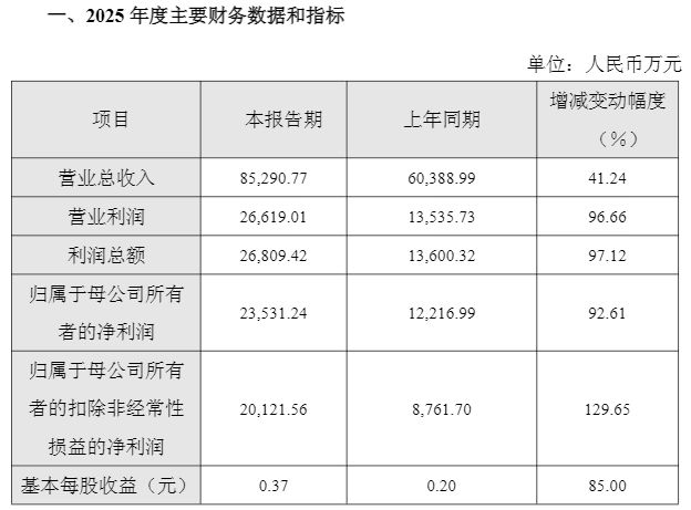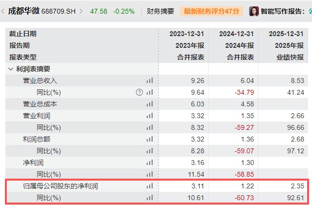 2月27日晚间,成都华微(SH688709,股价47.58元,市值45.49亿元)发布2025年业绩快报。受国内特种集成电路行业需求增加及承接多项国家重点科研项目影响,快报显示,公司2025年实现营业总收入约8.53亿元,同比增长41.24%;实现归属于母公司所有者的净利润约2.35亿元,同比增长92.61%;实现扣非净利润约2.01亿元,同比增长129.65%;基本每股收益0.37元,同比增长85%。